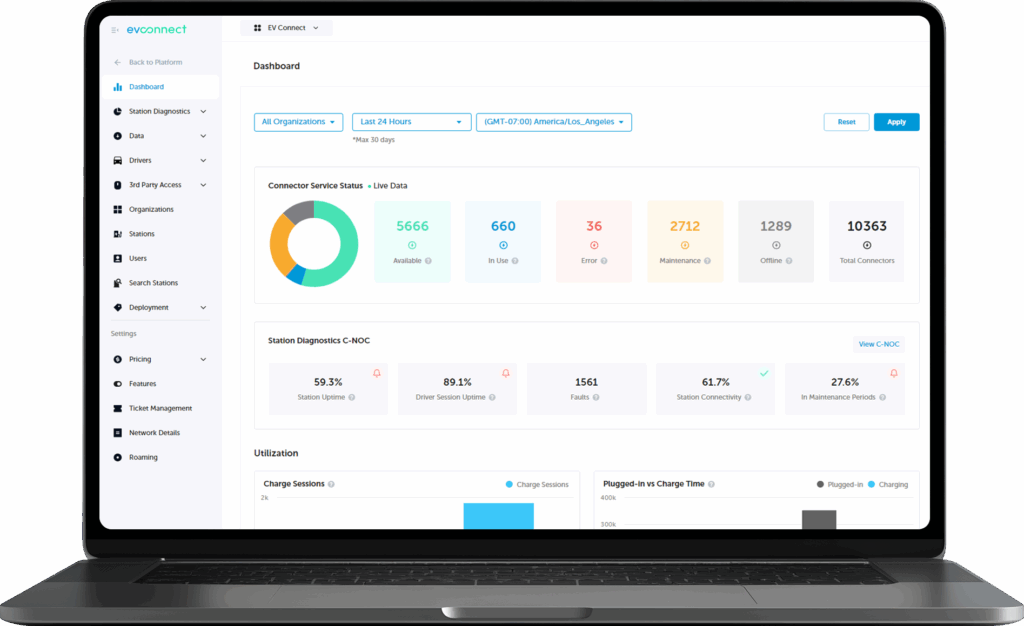 Monitor charger status, uptime, usage, and faults across locations from a single system.