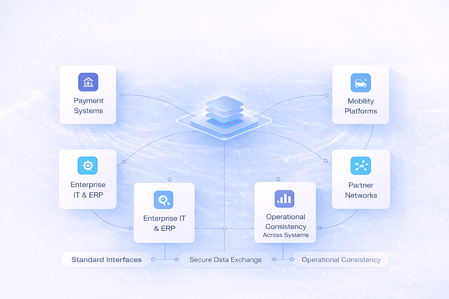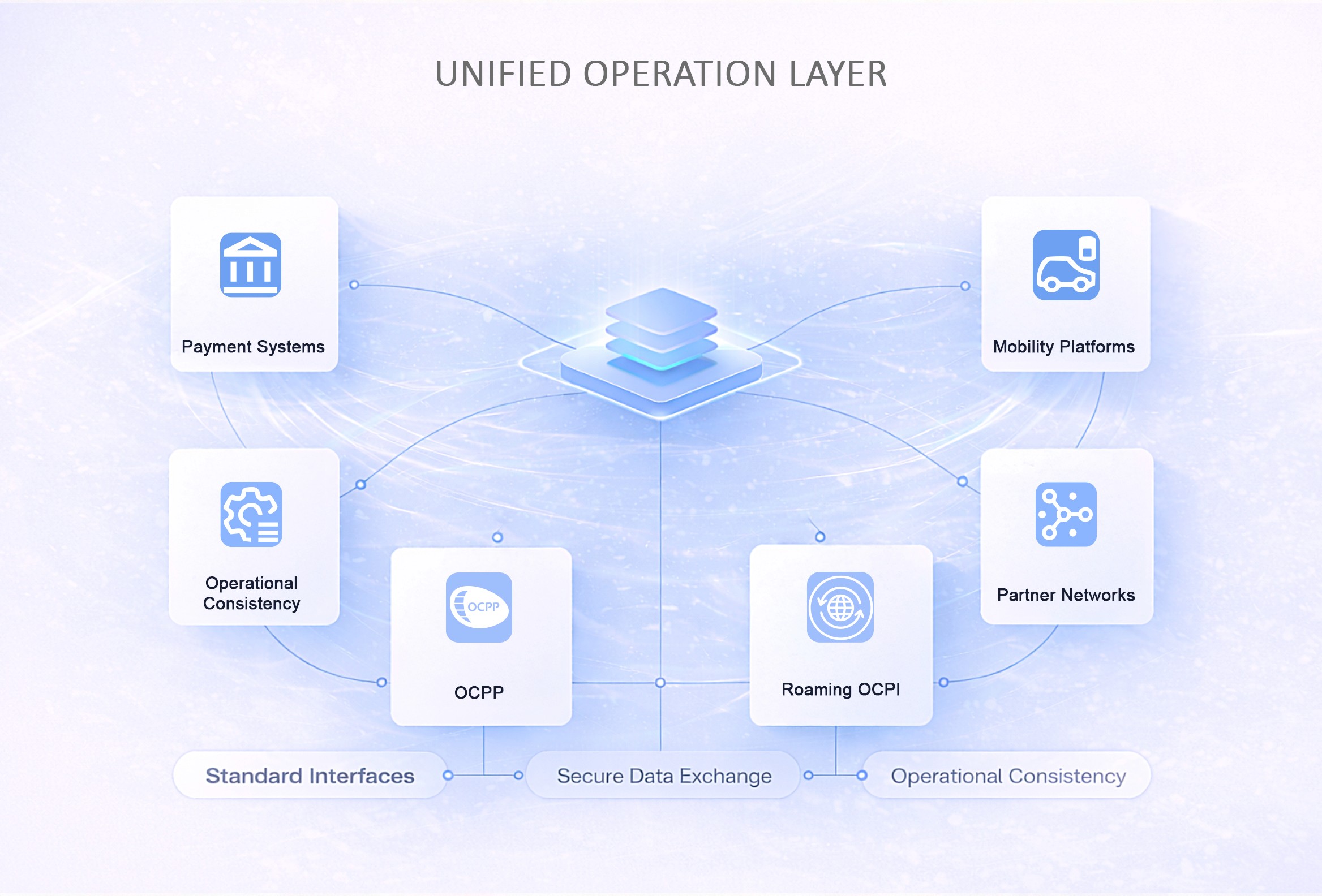 Interoperability Layer : Open standards (OCPP / OCPI), multi-vendor hardware support, roaming readiness.